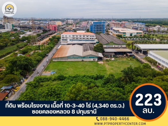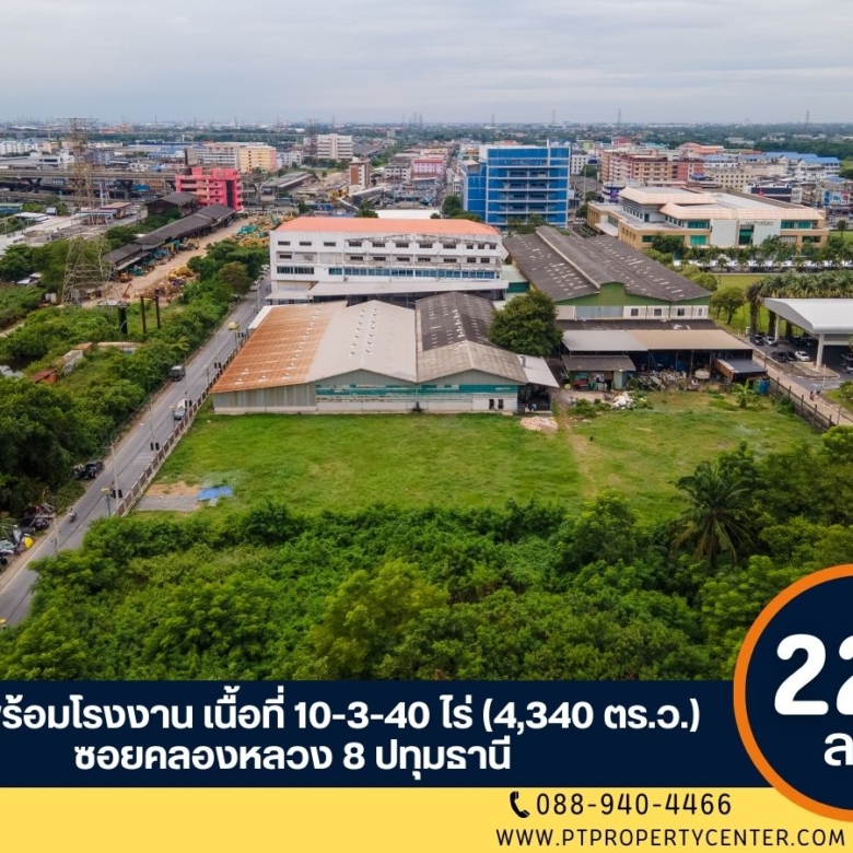 Land for sale with factory, area 10-3-40 rai, Soi Khlong Luang 8, Pathum Thani ที่ดินพร้อมโรงงาน เนื้อที่ 10-3-40 ไร่ (4,340 ตร.ว.) ซอยคลองหลวง 8 ปทุมธานี